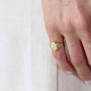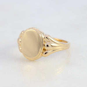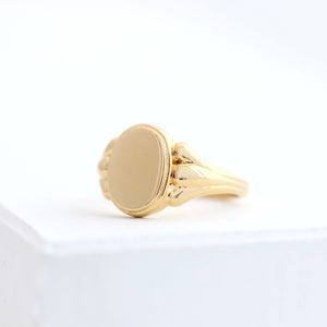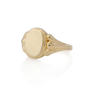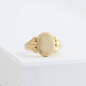 טבעת חותם אובלית מזהב 14 קראט, בעיצוב שמושפע מקווים נקיים של עמודים דוריים מהעולם הקלאסי.