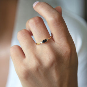 טבעת קורדליה היא טבעת זהב עדינה עם נגיעה צבעונית ומלאת חיים. במרכזה משובצת אבן טורמלין ירוקה בחיתוך בגט (מלבני), בגוון עמוק ורענן שמושך את העין. משני הצדדים שולבו שני יהלומים לבנים בקוטר 2 מ״מ, המוסיפים אור עדין ומאזנים את המראה כולו.