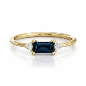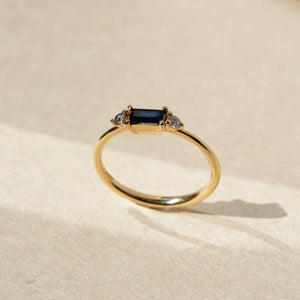 טבעת קורדליה היא טבעת זהב עדינה שמדגישה יופי נקי ומדויק. במרכז הטבעת משובצת אבן ספיר כחולה כהה בחיתוך בגט, קווים ישרים וגוון עמוק שמעניקים לה מראה אלגנטי ועכשווי. לצידה שני יהלומים לבנים בקוטר 2 מ״מ, המוסיפים איזון ואור עדין שמבליט עוד יותר את הכחול העשיר של הספיר.