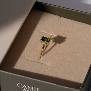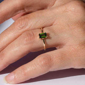 טבעת זהב עדינה עם נוכחות שקטה. במרכזה טורמלין ירוק טבעי בצורת מלבן, אבן עם עומק, שמשתנה באור ונושאת איתה תחושה של טבע חי ונושם.
