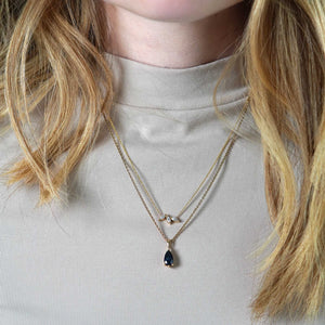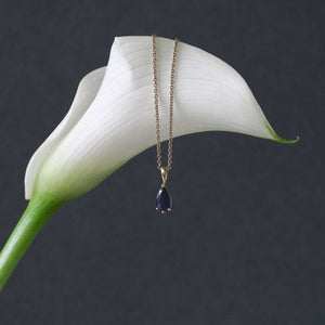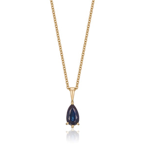 תליון זהב 14 קראט משובץ בספיר טבעי בצבע כחול-ירוק עמוק, בחיתוך טיפה שמזכיר טיפת מים שקטה.