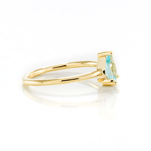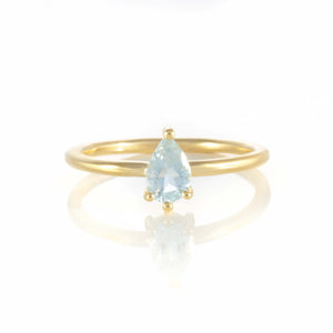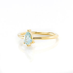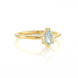 טבעת זהב עדינה עם אבן אקוומרין טבעית בגוון תכול רך ובחיתוך טיפה.