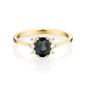 במרכז הטבעת אבן ספיר טבעית בגוון ירוק-כחול עמוק, בחיתוך אובלי קלאסי.