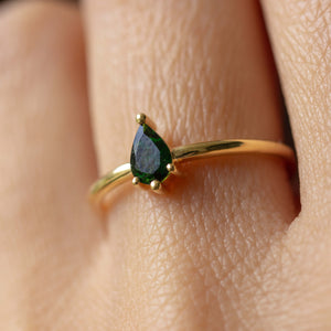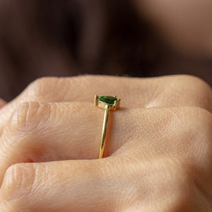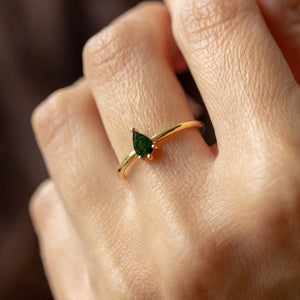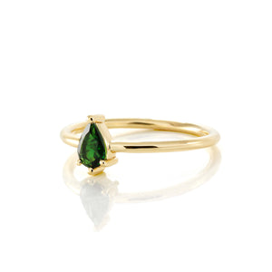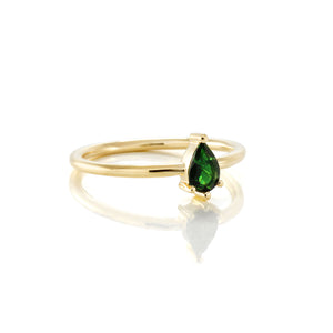 טבעת זהב עדינה, משובצת באבן טורמלין ירוקה בגוון עמוק ובוהק.