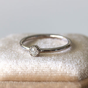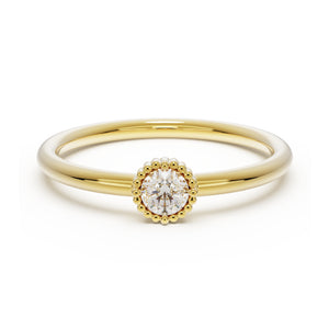 היהלום הלבן מוקף נקודות זהב זעירות שיוצרות הילה רכה ומוסיפות לטבעת מראה וינטג'י מדויק ומעודן.