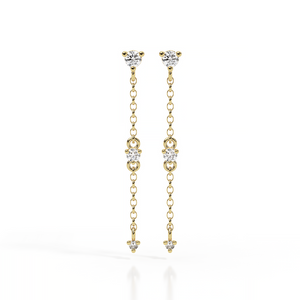 עגיל זהב עדין ונופל, שבו שלושה יהלומים לבנים משתלשלים במרווחים שווים על שרשרת זהב דקיקה.