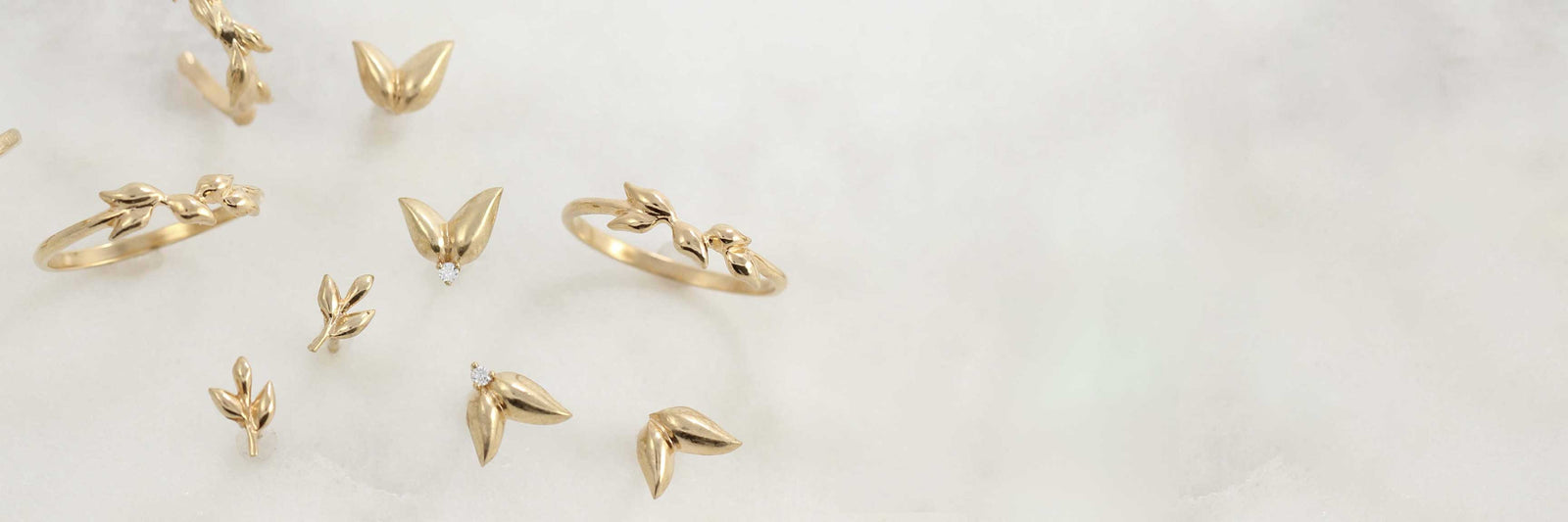 טבעות זהב, עגילים ושרשראות בקווים רכים ומדויקים, שנוצרו בעבודת יד בזהב 14 קראט, שואבים השראה מעלים, פרחים ומוטיבים אורגניים.