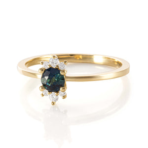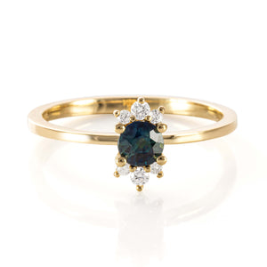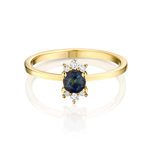 טבעת זהב עדינה עם אבן ספיר טבעית בגוון ירוק-כחול, שמזכיר ים שקט ומעמקים צלולים.